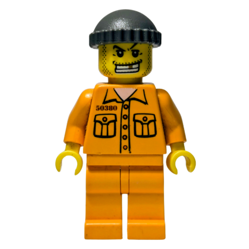 Minifigs Criminal , Orange Prison Outfit with #50380 , Dark Gray Hat , Gold Tooth (FIG - 008006)
