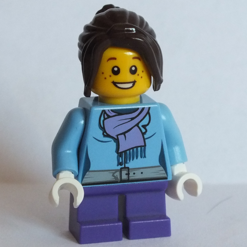 Minifigs Girl , Medium Blue Jacket with Medium Lavender Scarf , Short Dark Purple Legs (FIG - 006804)