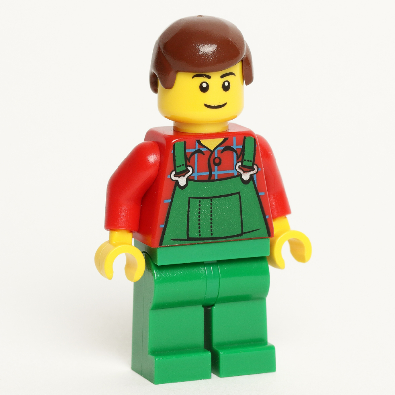 Minifigs Man , Green Overalls over Red Shirt , Reddish Brown Hair , Black Eyebrows (FIG - 011662)