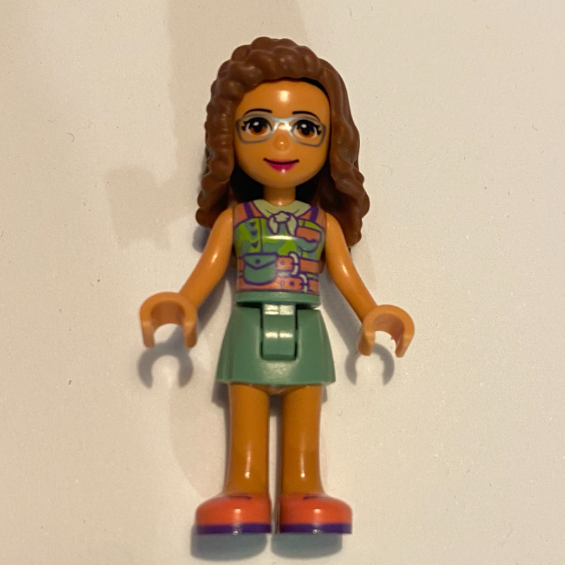 Minifigs Olivia - Dark Pink Top , Sand Green Skirt , Reddish Brown Hair , Bow (FIG - 010597)