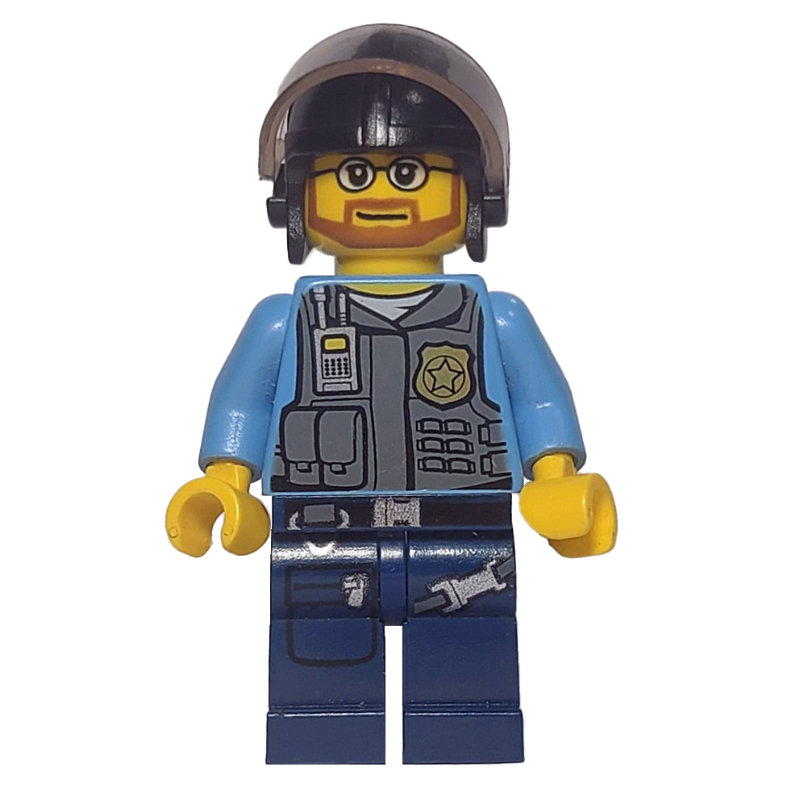 Radio , Badge and Pouches over Medium Blue Shirt , Black Helmet with Visor , Beard and Glasses (FIG - 007960)